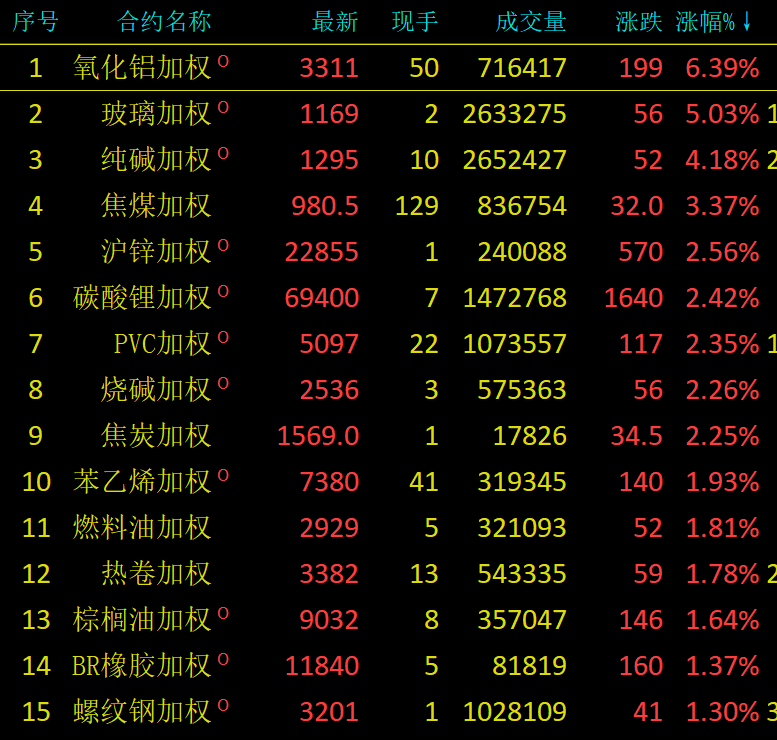 国内期货市场夜盘,工业品期货全线大涨,氧化铝期货主力合约收涨6.85%,玻璃、纯碱、焦煤涨幅均超3%。