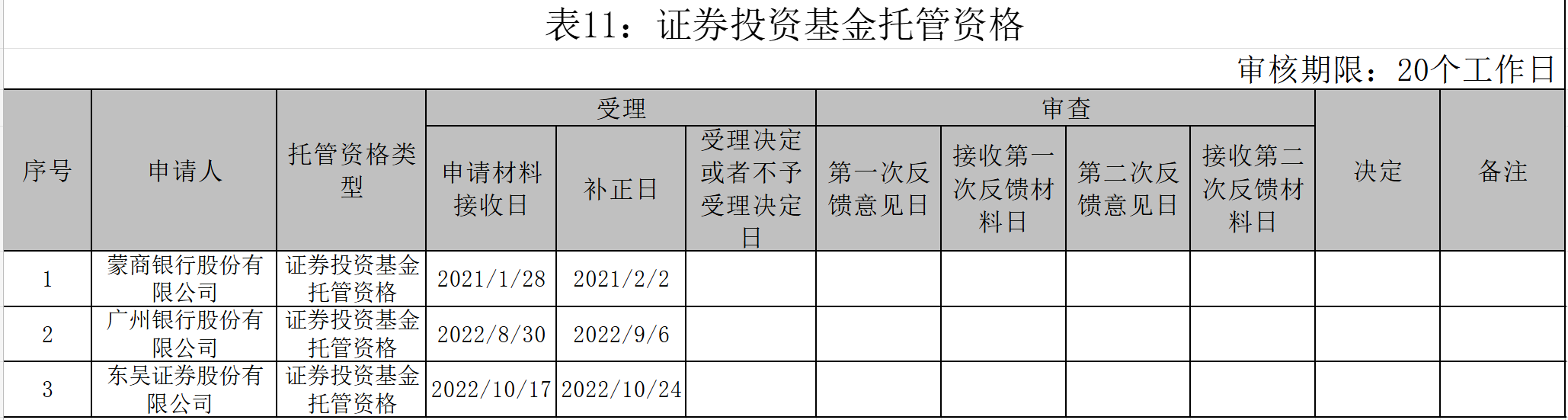 近日,证监会官网公示了证券、基金经营机构行政许可申请受理及审核情况。目前排队申请证券基金托管资格的机构仅剩3家,分别为东吴证券、蒙商银行和广州银行,3家机构的申请材料接收日分别为2021年1月28日、2022年8月30日、2022年10月17日。